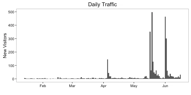 visitors <- compute_visitors(actions)days <- compute_days(actions)pages <- compute_pages(actions, base_url = "amarder.github.io")sources <- compute_sources(visits)Traffic Over Time